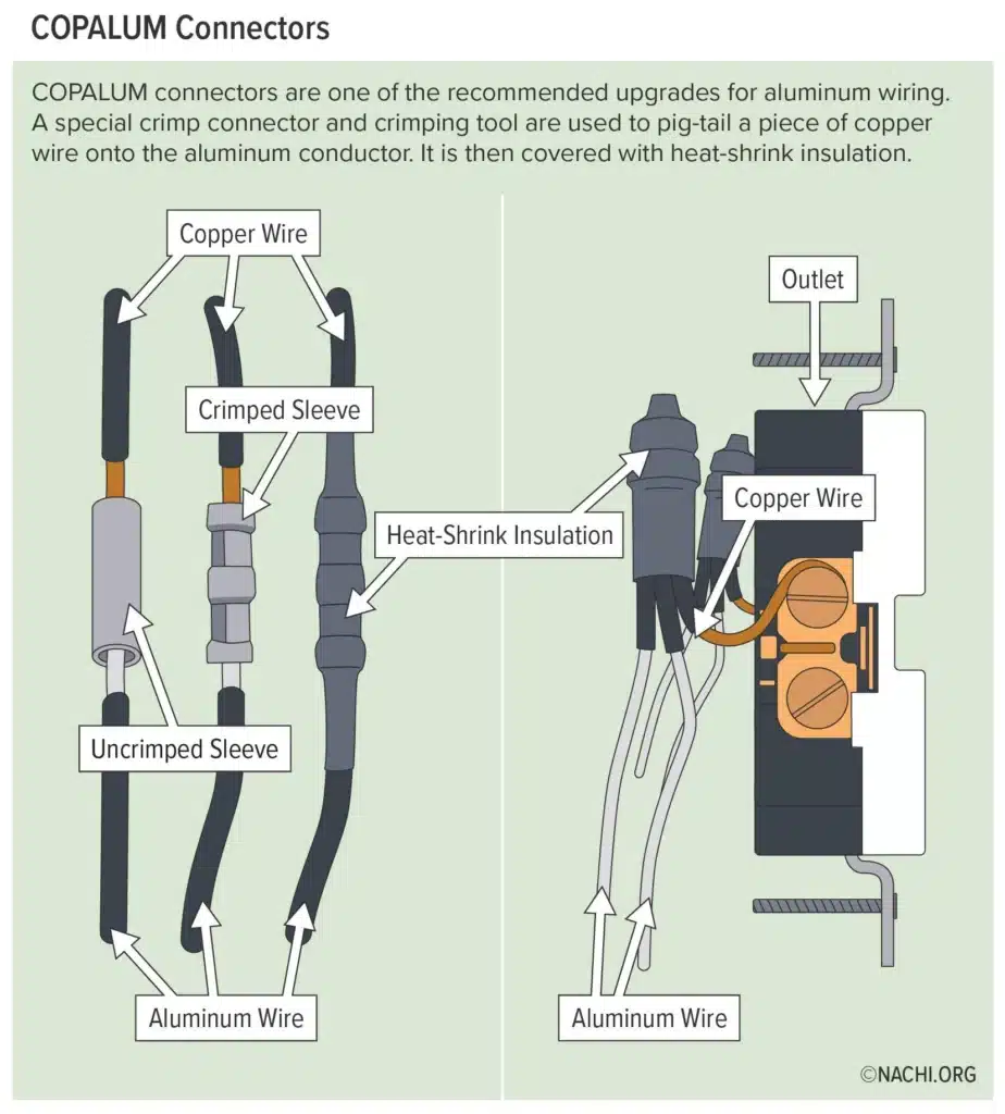 If your home has single strand aluminum you may be required to have \”remediation\” done to get home owners insurance. As mentioned before the only two types of connectors are Alumiconn and Copalum connectors. An electrician will need to install these at every outlet and light fixture. Due to the size of the alumiconn connectors they may also need to install larger junction boxes for the outlets. The current rate for an alumiconn connector sold in bulk is going to range from $3-$4. Each outlet will require 3 connectors(one for hot, neutral & ground) so you can see how this can get pretty expensive depending on the size of the home.