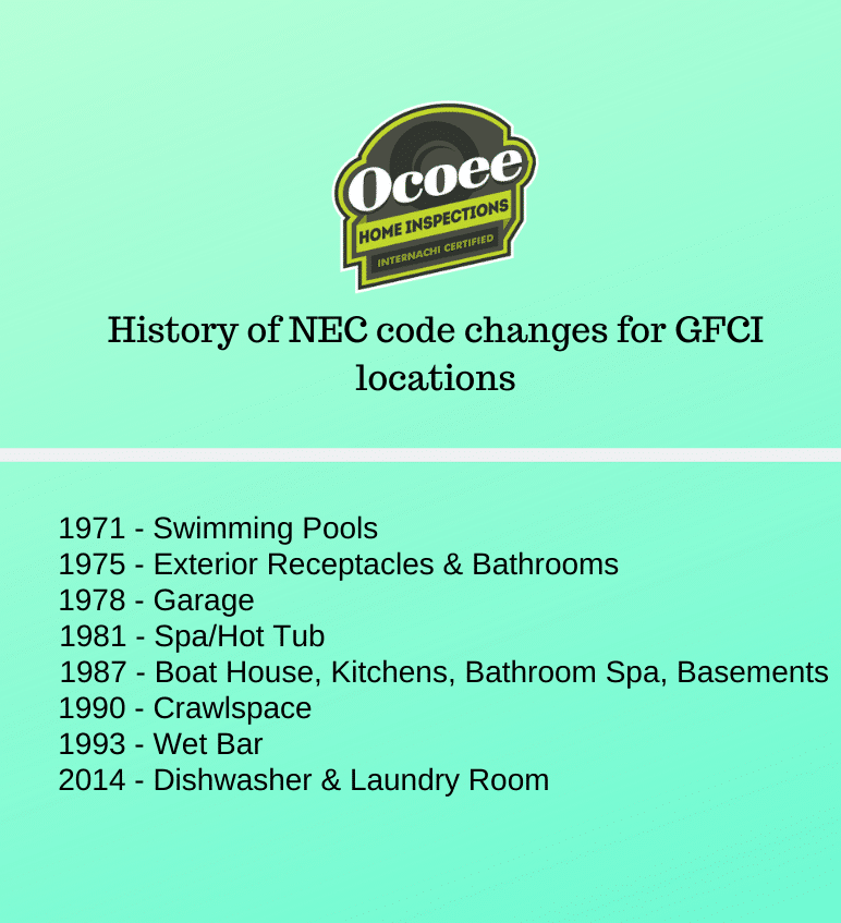 Before GFCI outlets were required in homes there were an estimated 700-1000 deaths a year from electric shock. The NEC (National Electric Code) first required that all outlets by the swimming pool be protected starting in 1971. The next code year was 1975 and they added that all exterior and bathroom outlets be protected. The next code year was 1978 and they added Garage and hot tub requirements. If you are starting to notice a trend that they are required anywhere water can come in contact with electricity you would be correct.