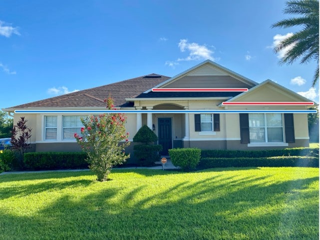 The wind mitigation form states that a roof will be counted as a Hip roof if there are no other shapes that are more than 10% of the roofs perimeter. This means that if your roof has a total perimeter of 300 feet then you can only have 29 feet or less of non Hip shape features(gable, flat roof). The photos below show the roof perimeter(blue line) and the non hip features(red lines). Although the majority of the roof has hip features, the two gables at the front put it over the 10% mark allowed on the form.