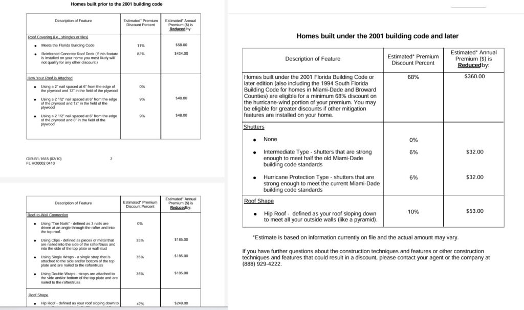 The first discount on the form has to do with the changes made to the 2001 Florida Building Code. If your house has a permit application date of 03/01/2002 or after then your house will qualify for this. There are homes that show they were built in 2002-2003 but when we look at the permit the builder had actually applied for a building permit before this date. These homes unfortunately would not qualify for this discount.